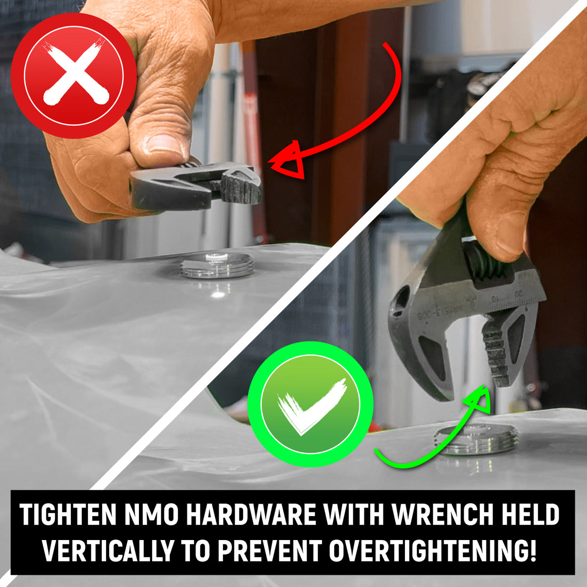 NOTE: The center conductor inside the NMO antenna stud is not solid metal and can be damaged if overtightened. As shown in the photo above, when installing the NMO nut, we recommend holding the wrench vertically to reduce torque and overtightening.