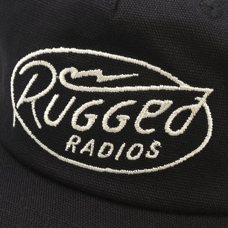 The Rugged Radios Bolt hat features flat embroidery with an unstructured 5 panel design.